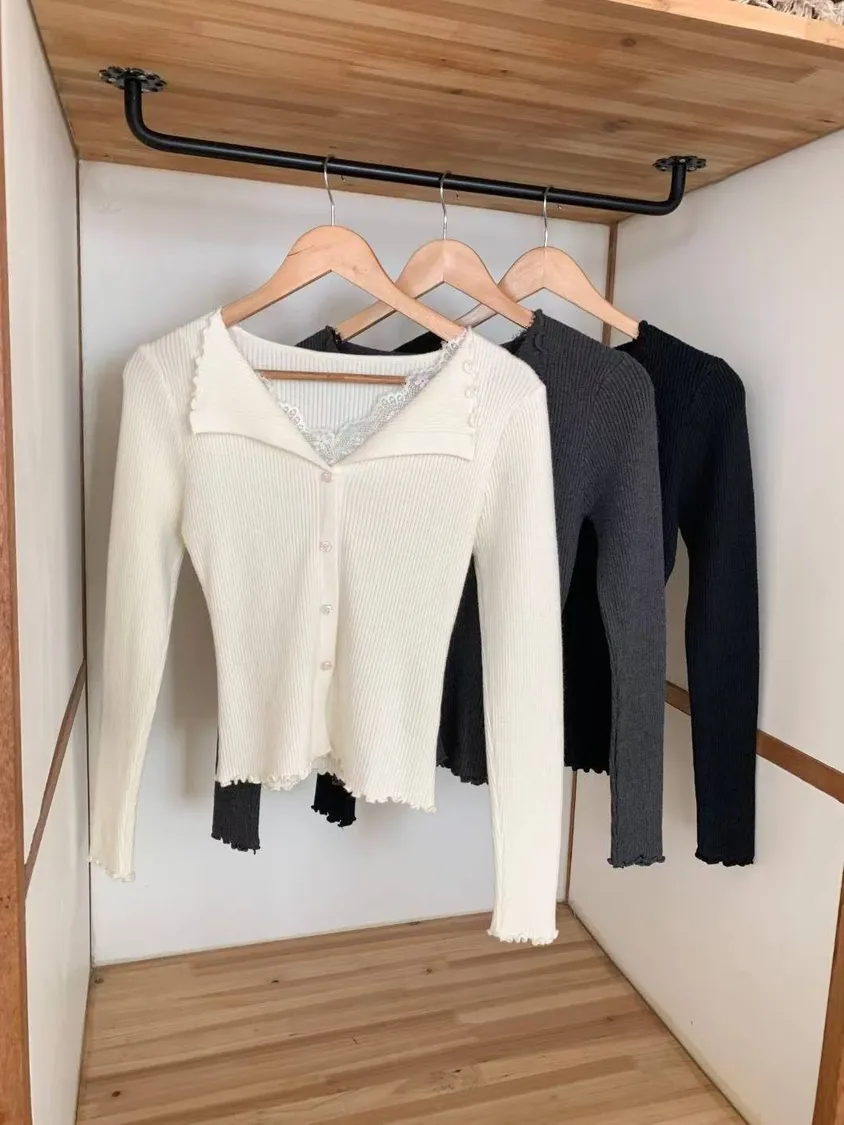 精緻貼身翻領拼接蕾絲修身上衣