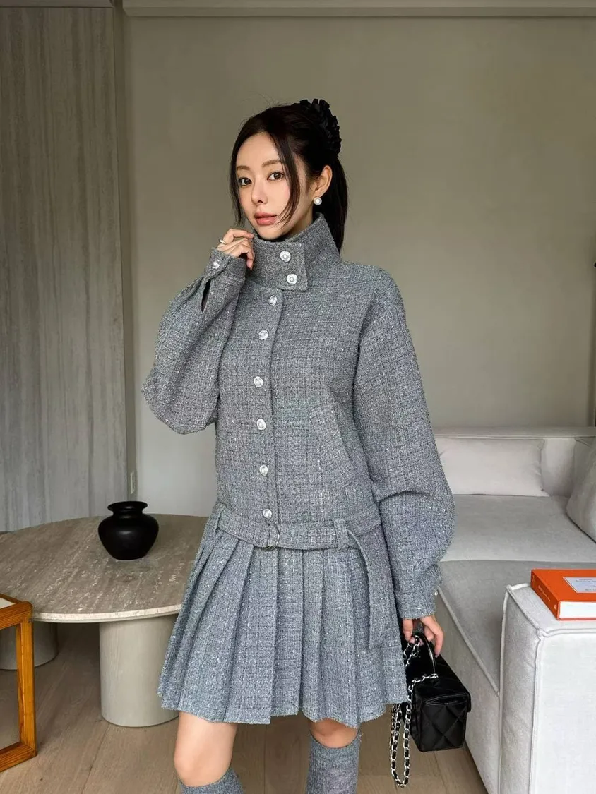 設計款小香毛呢圍脖百褶洋裝(羊毛30%)
