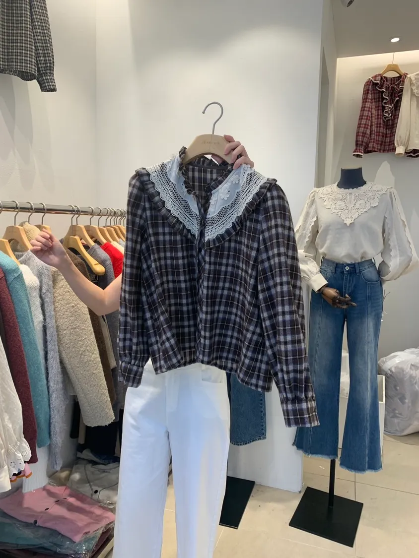 方格混色拼接蕾絲領上衣
