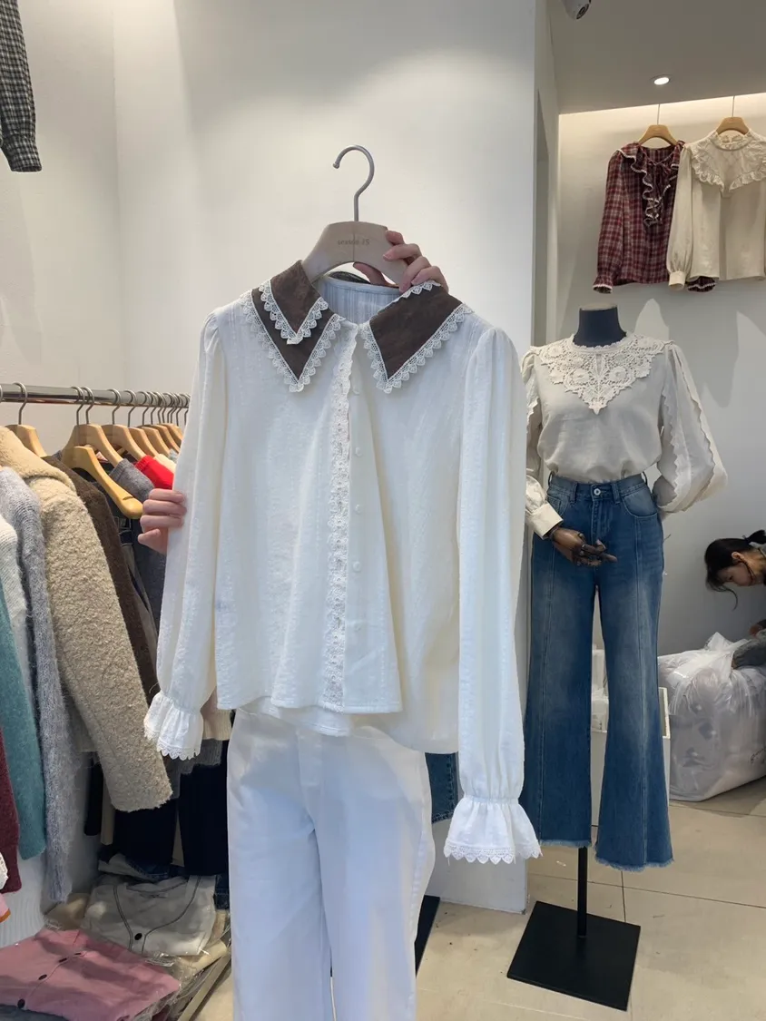 立領蕾絲滾邊排扣上衣