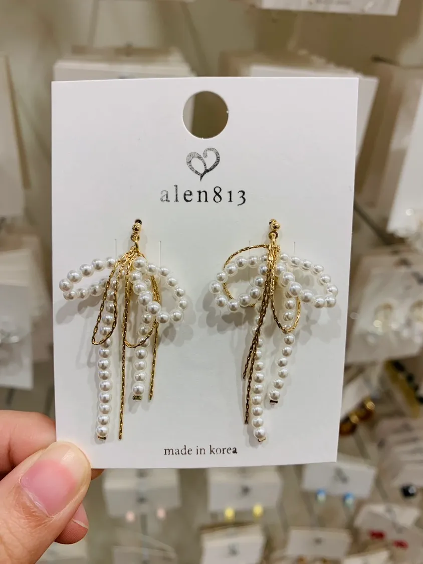 垂墜感小珍珠蝴蝶結中長款耳飾