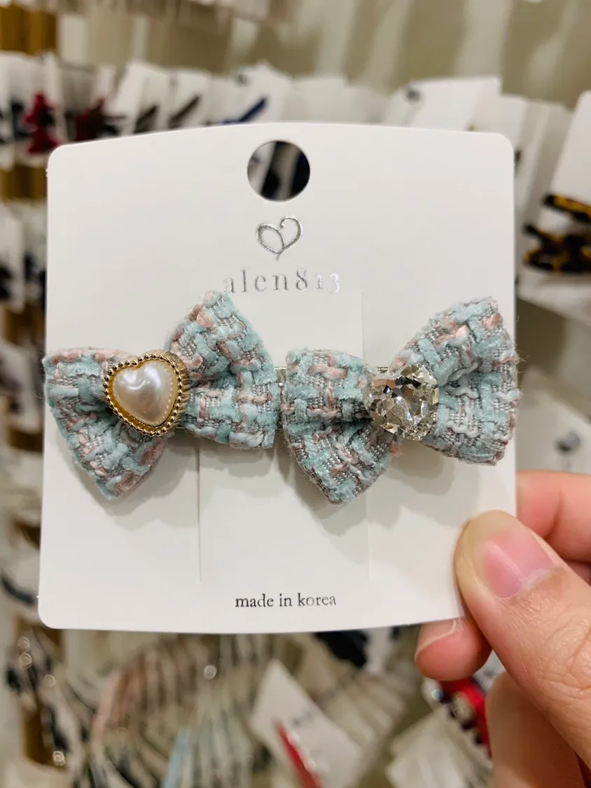 雙蝴蝶結毛呢鑲鑽髮夾