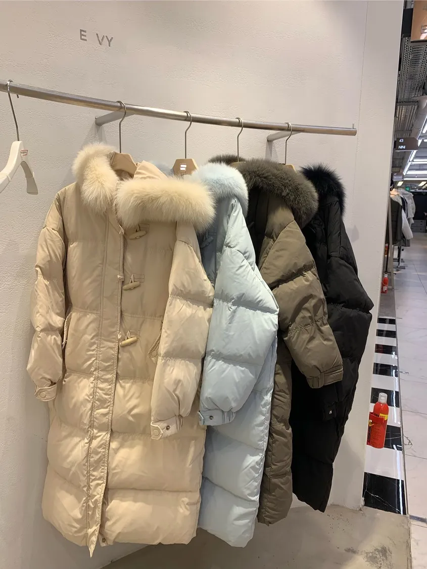 長版狐狸毛圈鴨絨牛角扣款羽絨外套
