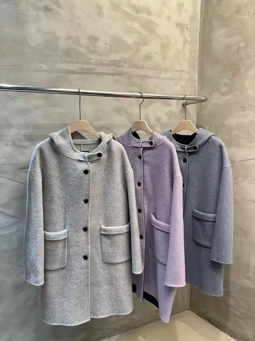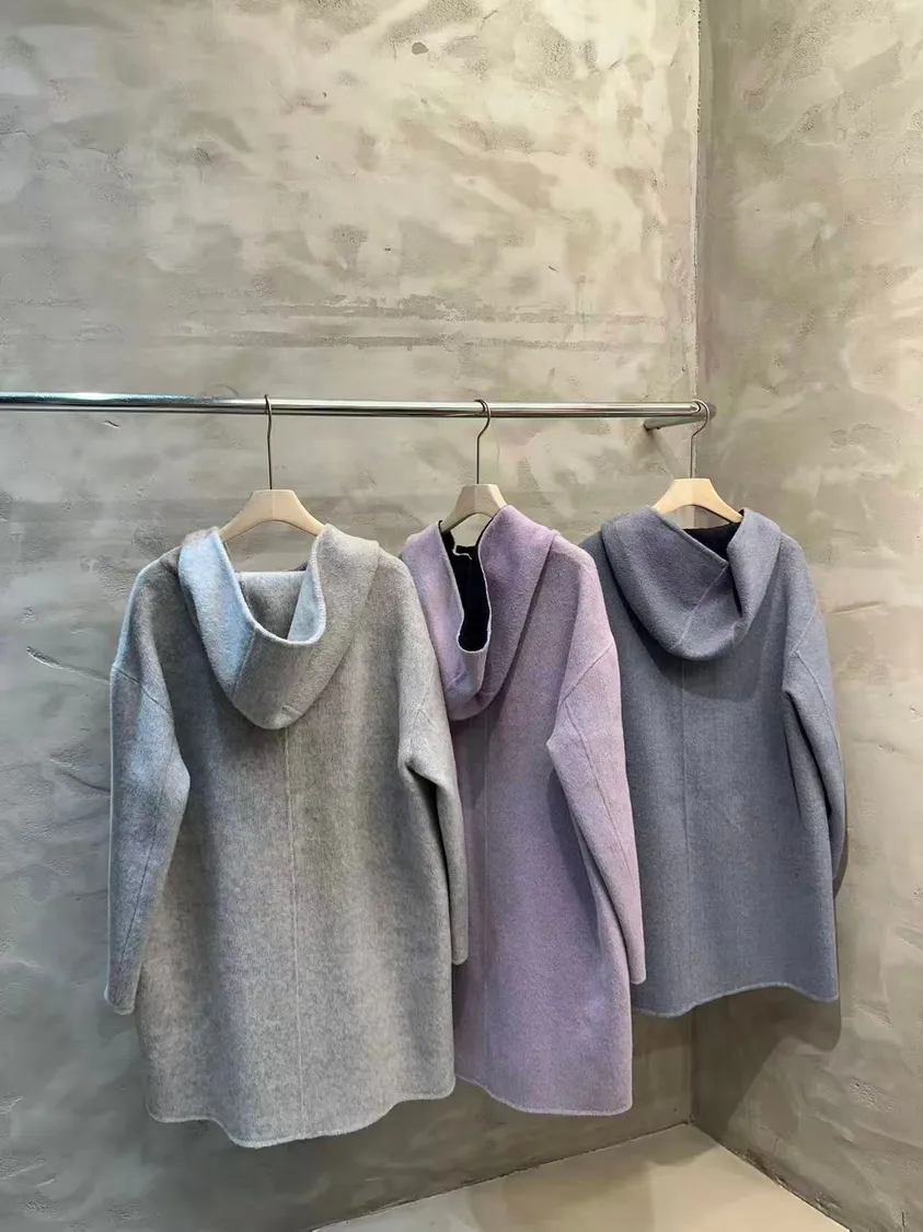 雙色連帽中長版羊毛大衣(80%羊毛+20%cashmere)