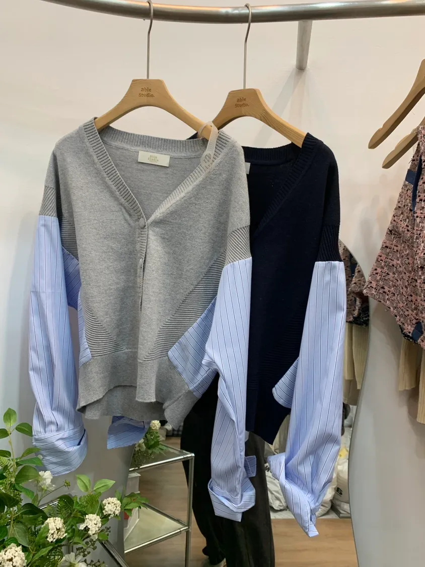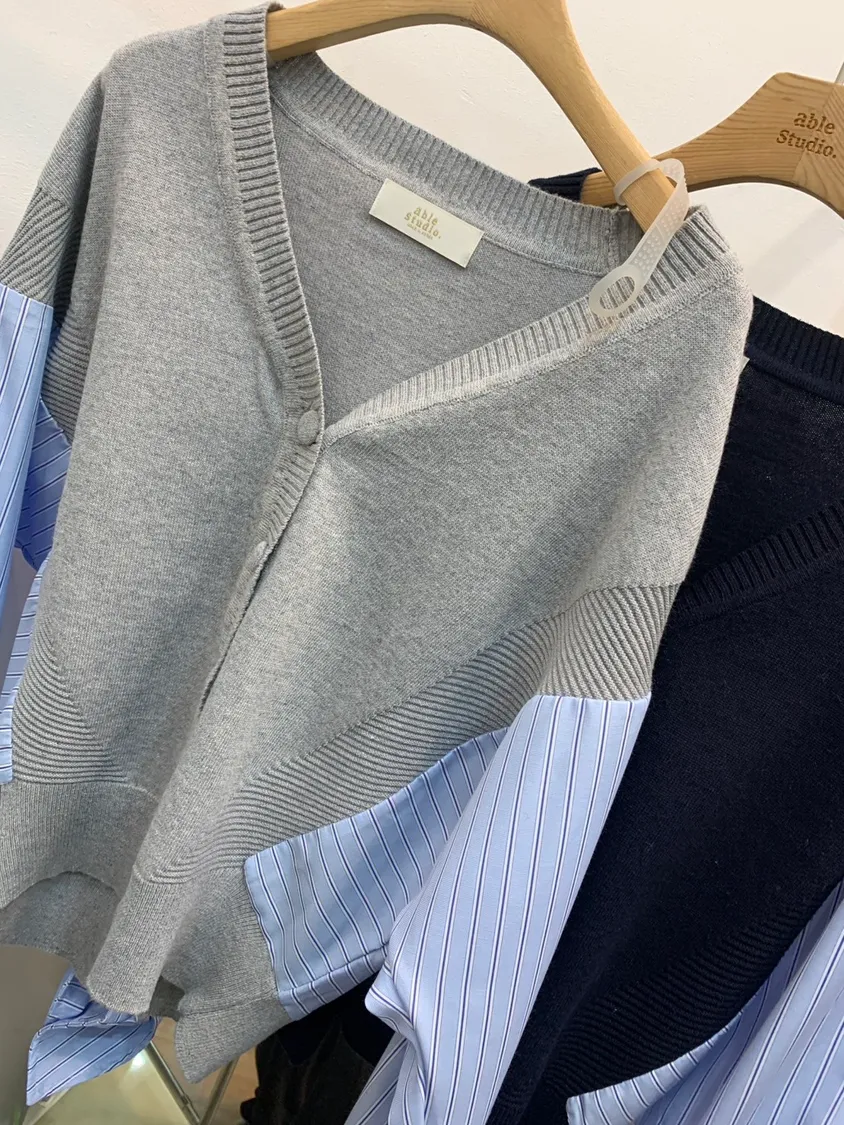 直紋襯衫拼接針織上衣