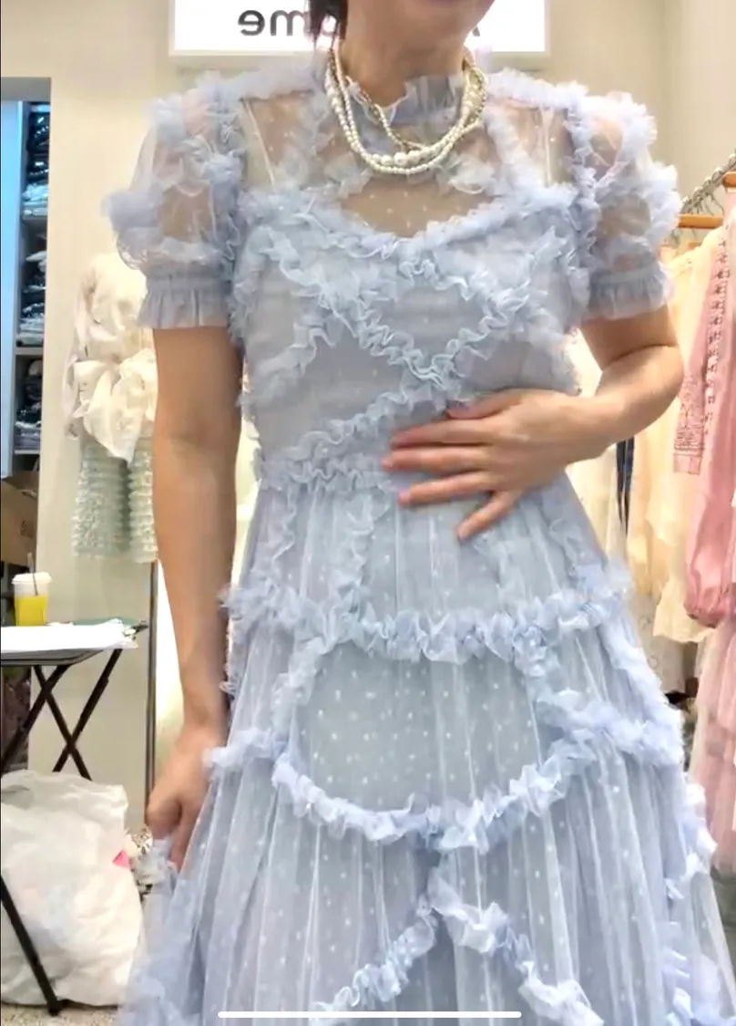設計款多蕾絲奶油捲邊波點蕾絲洋裝