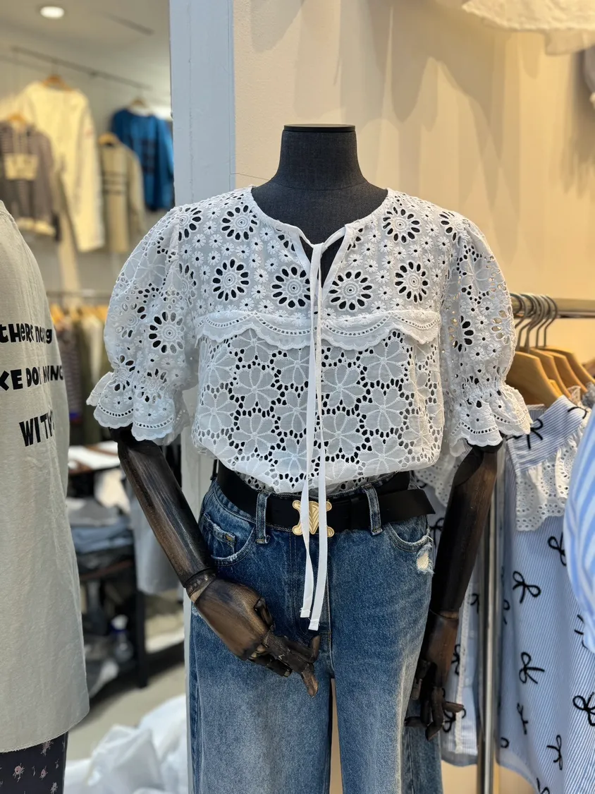 透膚鏤空蕾絲拼接滿版花紋上衣