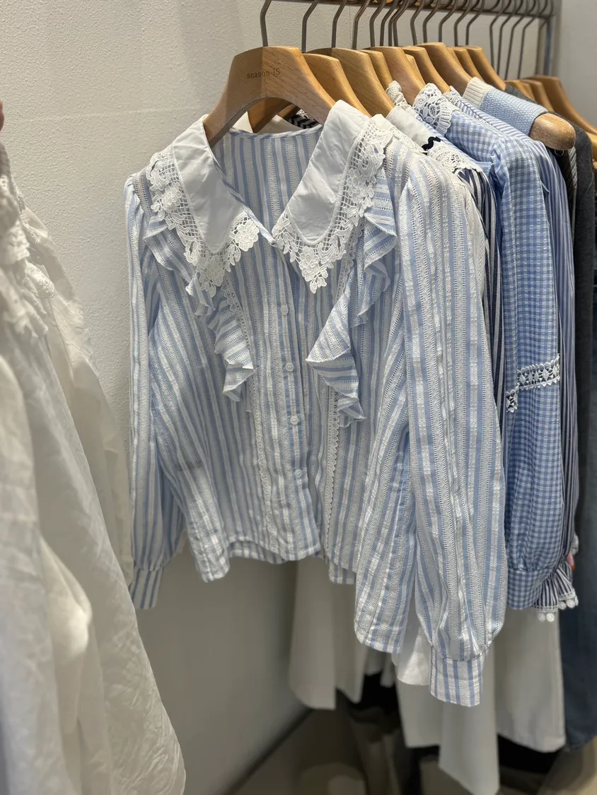 雙領蕾絲拼接滾邊直紋上衣